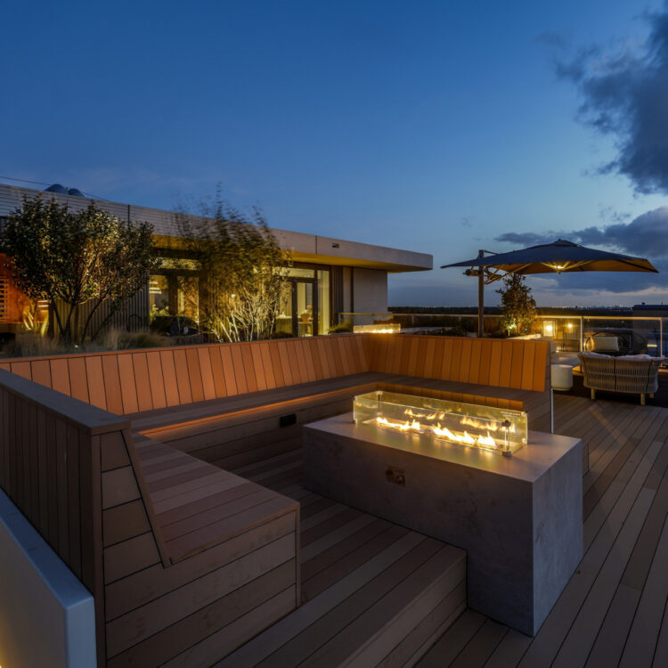 Dit recent project illustreert hoe ver esthetiek en functionaliteit kunnen reiken. Op het hoogste punt van de kustlijn van Kijkduin realiseerden Garden Vision een adembenemend wrap-around dakterras met een luxueus samenspel van architectuur, natuur en outdoor living. We creëerden een exclusief wellnessgedeelte, met als absolute blikvanger een maatwerksauna die volledig is geïntegreerd in de gevel van het penthouse. Een wellnessparel hoog boven de stad!