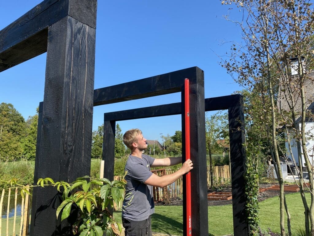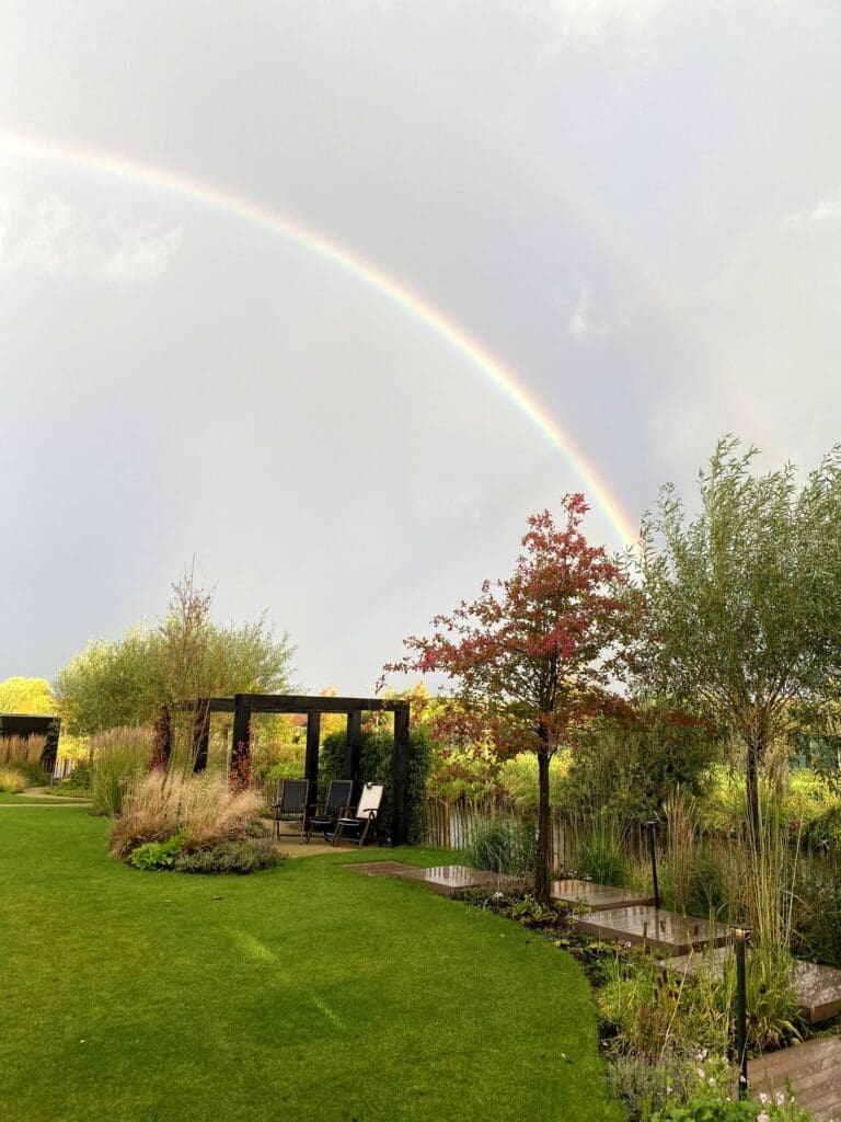 Deze landelijke tuin heeft met z’n natuurlijke organische vormen een ingetogen sfeer maar herbegt wel alle genotsaspecten voor het hele gezin; een jacuzzi, een moestuinkas met kippenweide, kruidenbakken, speelgazon, sierlijk ingebouwde trampoline, een groot Esthecterras met design buitenkeuken en loungehoek, een robuuste pergola met schommel, en avontuurlijke wandelpaden. Daarom heen zijn verschillende stijlvolle zithoekjes gecreëerd maar de diepe zichtlijnen vanuit de woning zijn behouden.In de procesbeelden is goed te zien hoe van drainage t/m beplantingsplan alle stappen vakkundig zijn uitgevoerd. Deel 2 waarvan al 3D renders zijn zal bestaan uit een zwembad en wellness sauna met poolhouse en boothuis erin. Doordat de infinitypool als het ware in de naast gelegen vaart is geintegreerd gaat de wellness tuin adembenemend op in zijn natuurlijke omgeving.
