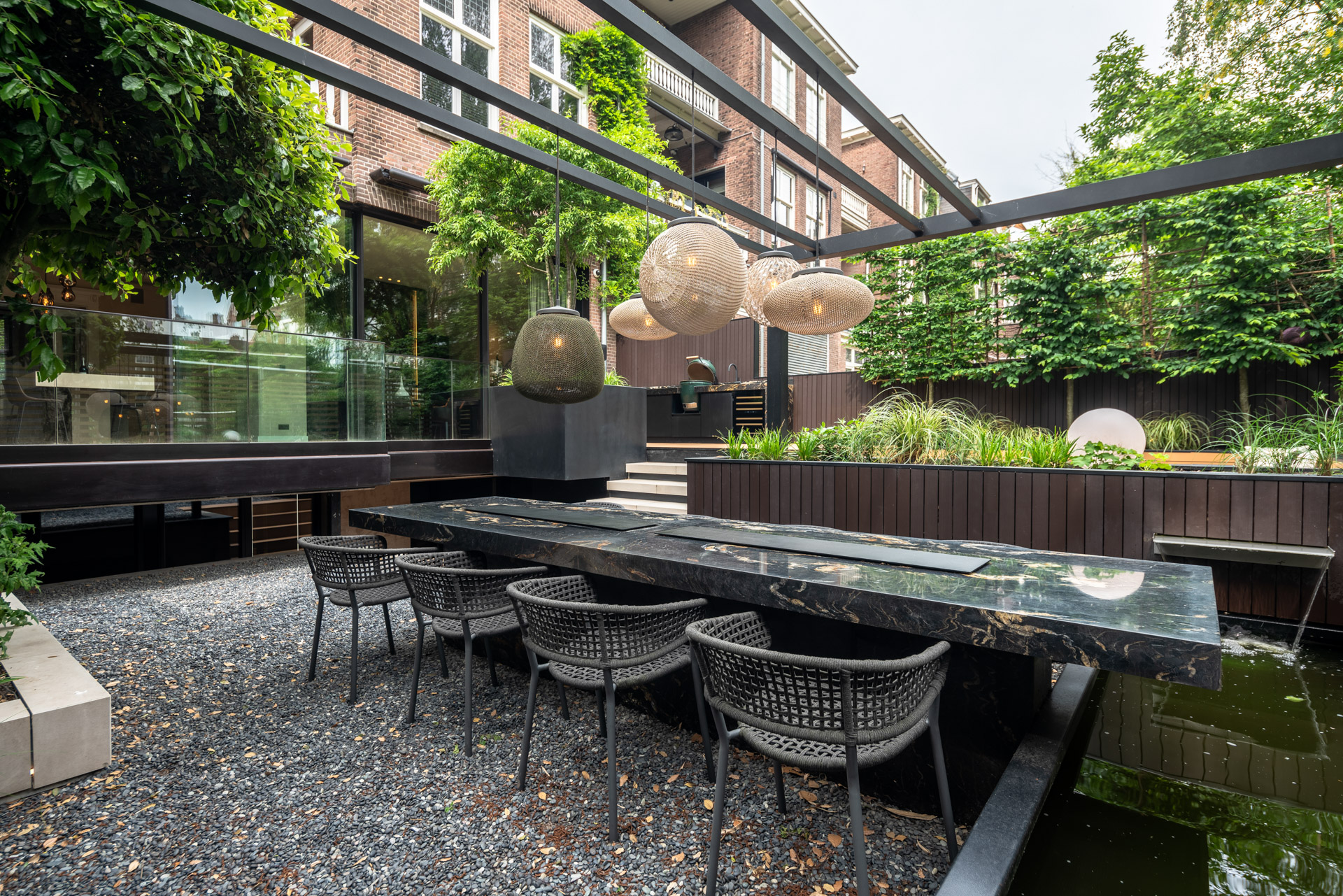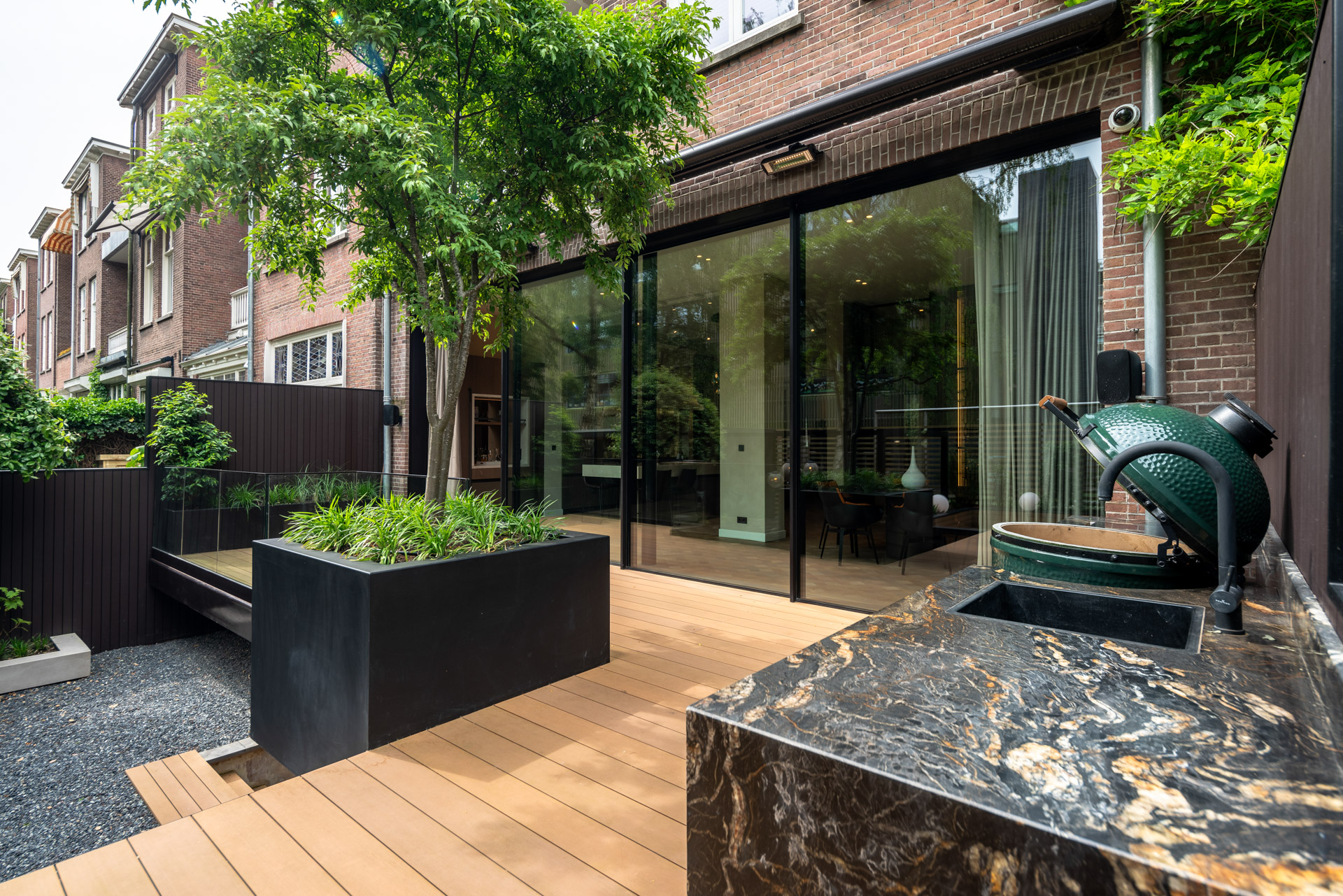 Door de metershoge schuifpui die volledig opengeschoven kan worden is de tuin en dus ook buitenkeuken volledig bij de living van het grachtenpand te betrekken. Hier kan men met allure buiten barbecueën en dineren op hoogwaardig niveau.