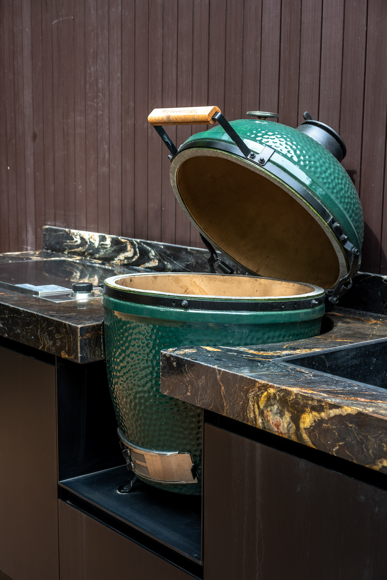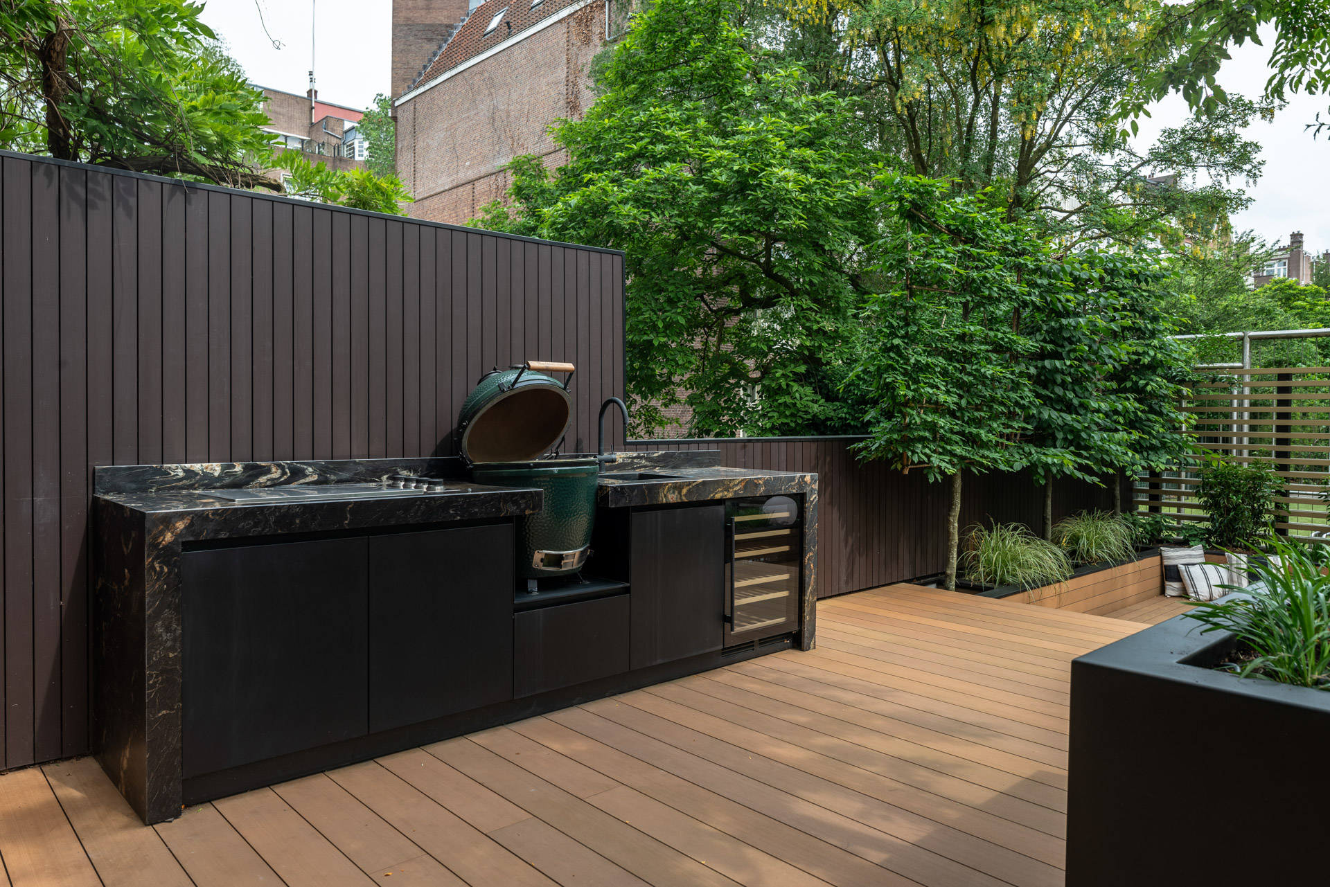 De zeer hoogwaardige maatwerk outdoorkitchen is van alle denkbare luxe voorzien. Tijdens de BBQ kun je naast de kamado ook de elektrische bakplaat gebruiken. De ingebouwde Big Green Egg is centraal gesteld en heeft als het ware een welverdiend podium gekregen. Daarnaast een verzonken zwarte wasbak met bijpassende zwarte buitenkraan. De buitenkeuken maakte we compleet met ingebouwde wijnklimaatkast.
