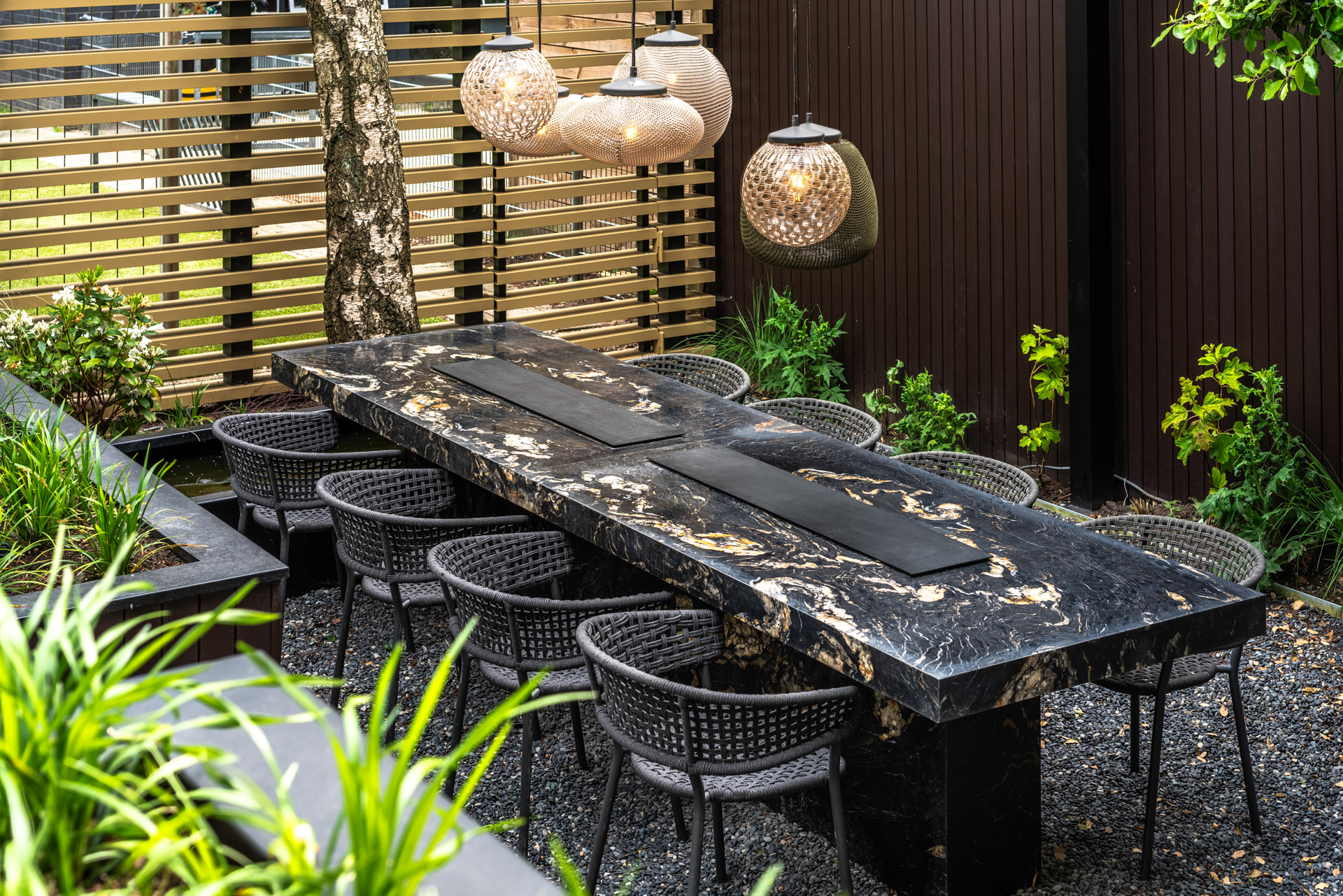 Het keukenblad vervaardigde we in dezelfde lijn als de overige buitenmeubels in hoogwaardig natuursteen. Dit kwartsiet hebben we geselecteerd omdat het geschikt is voor buitengebruik. Het Belvedere kwartsiet verkozen we in dit project vanwege de marmerachtige uitstraling met de fijne goudkleurige adering. In de imposante stadstuin komen de gouden elementen overal terug met een luxe knipoog. Het keukenblad matcht vervolgens weer perfect bij de mat zwart gepoedercoate keukenkastjes.