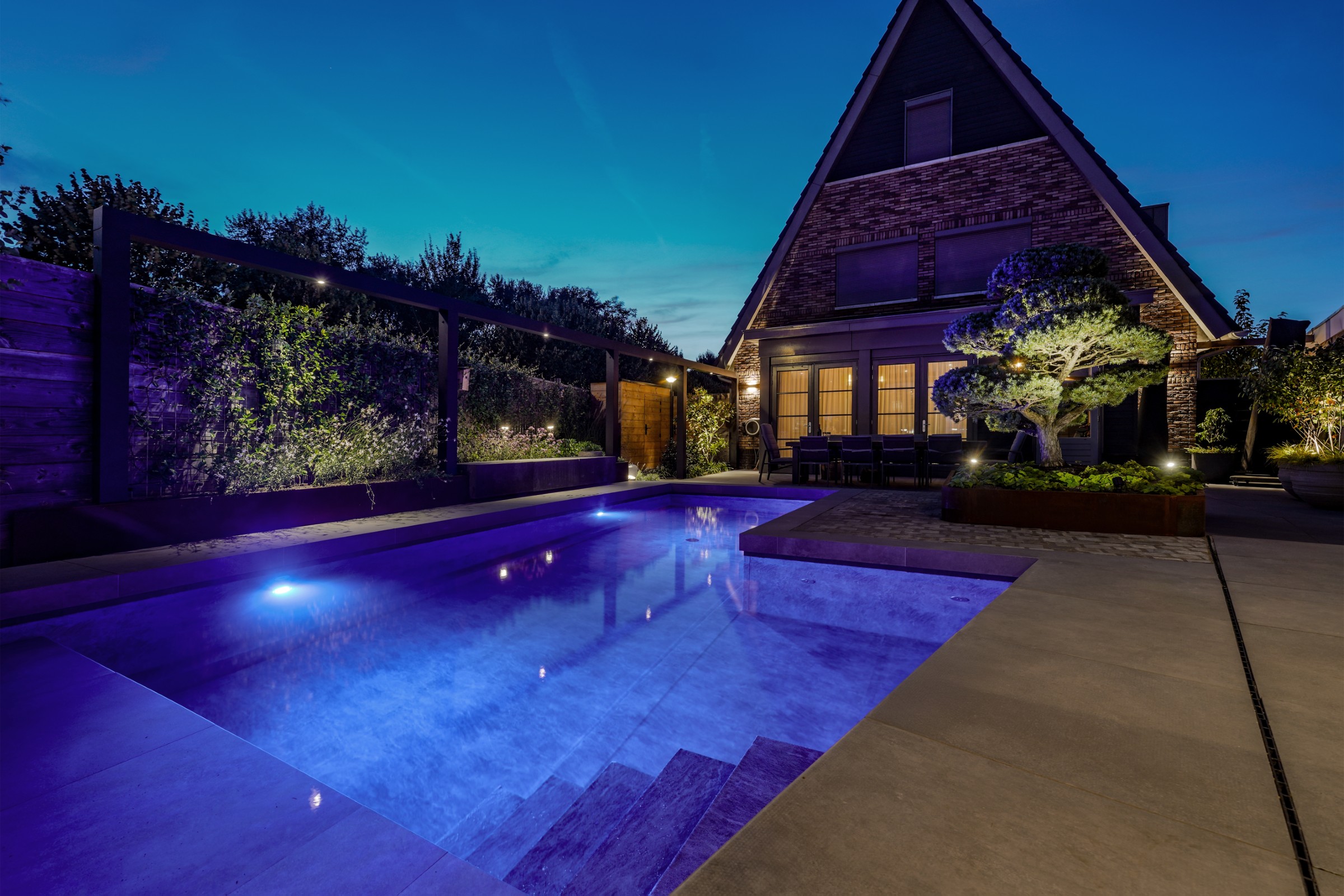 In collaboration with Waterwel, we created an impressive 7-meter-long swimming pool in the center of the garden, designed in a bold cubist shape. The custom-made pool has a refined finish with ceramic miter edges that create a razor-sharp line. Stainless steel accents such as RGB underwater lighting create a colorful and luxurious atmosphere in the evening hours. At the end of the swimming pool, we installed a white Luxcom wall with an integrated waterfall—a subtle but powerful element that adds tranquility and dynamism to the whole.