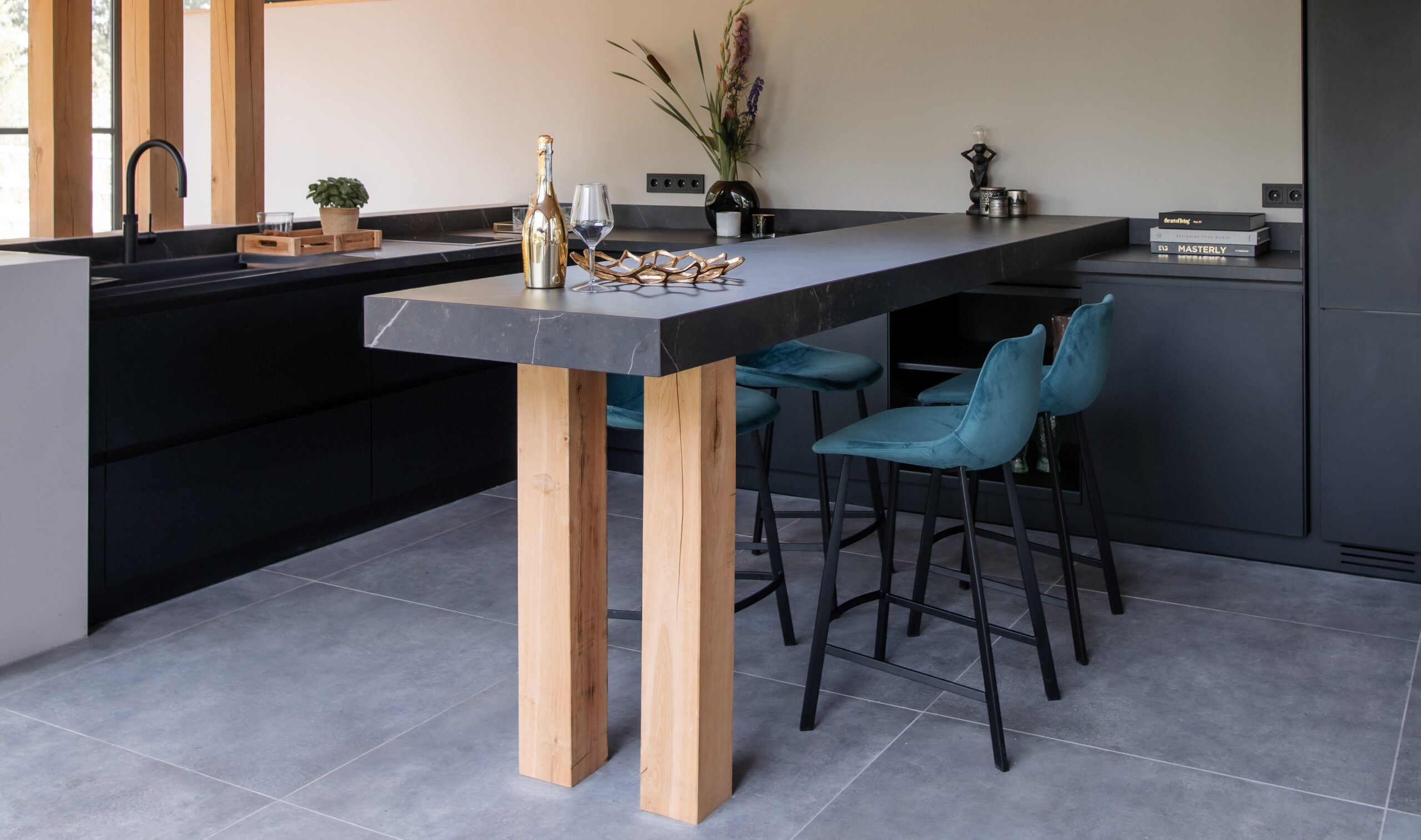 Centraal in de buitenkeuken staat het imposante barblad, vervaardigd uit hoogwaardig Dekton in de kleur Kelya – een diepe, zwarte tint met subtiele witte aders en vlekken. Dit aanrechtblad straalt niet alleen klasse uit, maar is ook bestand tegen alle weersinvloeden. Dekton wordt namelijk gemaakt uit een mengsel van glas, porselein en kwarts en is daardoor bijzonder hard maar met een zeer natuurlijke look. De zwarte aluminium keukenkastjes zijn mat gepoedercoat en sluiten naadloos aan bij het chique karakter van het ontwerp (zie de 3D-renders). Op het aanrechtgedeelte is te zien hoe we in verstek een luxe backsplash hebben aangebracht.
